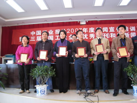本報(bào)訊 日前,在云南省大理市召開的中國工業(yè)報(bào)社2007年度新聞宣傳培訓(xùn)班暨第三屆中國工業(yè)企業(yè)優(yōu)秀報(bào)刊和好新聞?lì)I(lǐng)獎(jiǎng)大會(huì)上,我《杭機(jī)集團(tuán)報(bào)》被評(píng)為中國工業(yè)企業(yè)2007年度優(yōu)秀報(bào)刊一等獎(jiǎng),其獲獎(jiǎng)?wù)Z是:欄目豐富、形式活潑、文章短小精悍,并出版中德雙語報(bào),便于外籍專家了解企業(yè)動(dòng)態(tài)。本報(bào)記者陳烈新采寫的《首席工程師加冕儀式在中科院杭州科技園舉行》報(bào)道,榮獲好新聞(消息)評(píng)選二等獎(jiǎng),這反映了我集團(tuán)重視人才隊(duì)伍建設(shè)引起了媒體的關(guān)注和肯定。集團(tuán)公司黨委書記董事長(zhǎng)朱金根獲悉,當(dāng)即給出席頒獎(jiǎng)會(huì)的主編王忠民發(fā)賀訊:“祝賀你,并與你們共享榮譽(yù)和喜悅!”